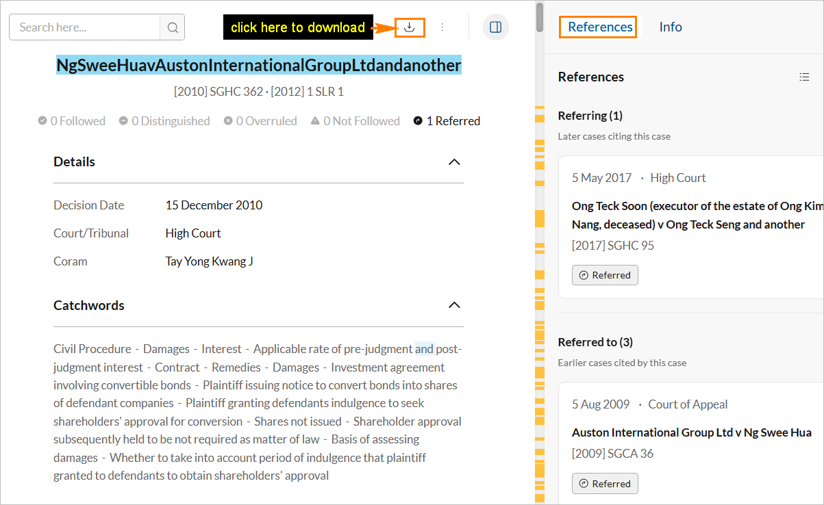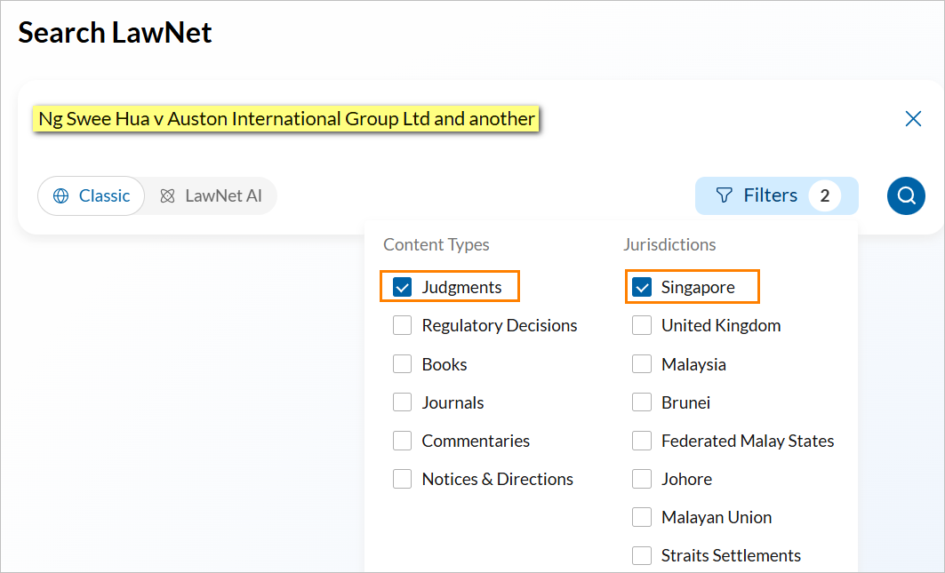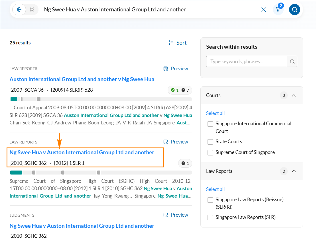 Enter search terms (case name or citation) in the search box. Click on 'filters' and select the jurisdiction 'Singapore' and the content type 'Judgments'. Click search to find the case.