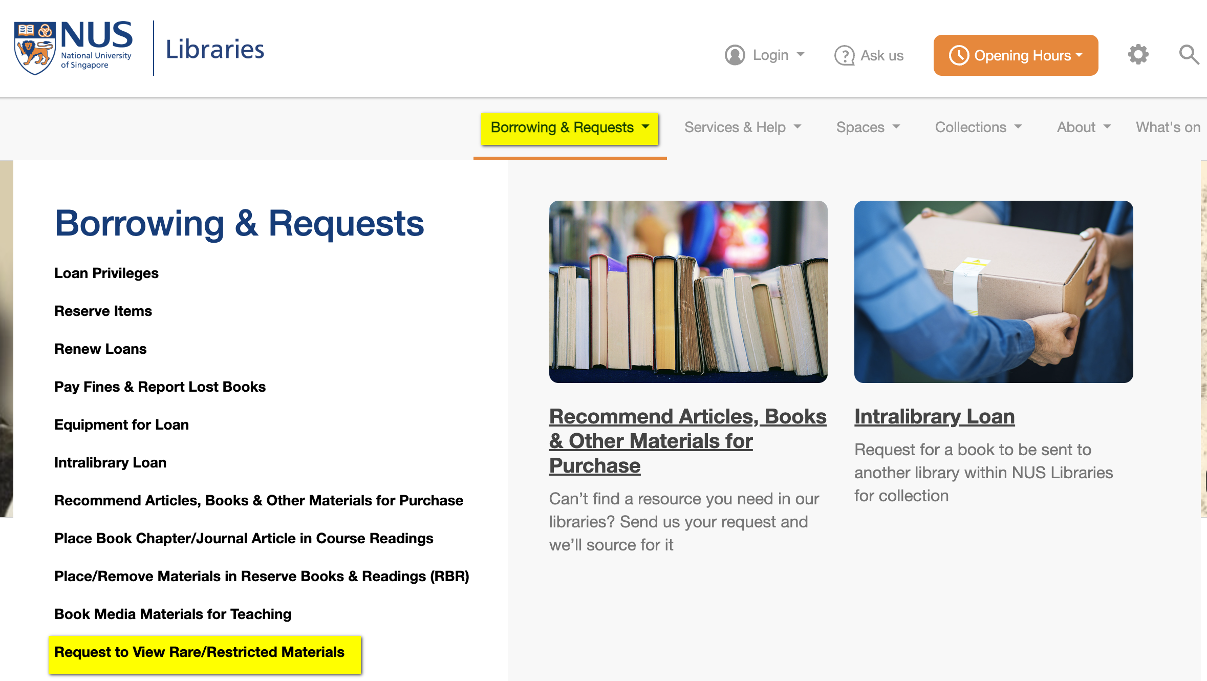 (1)  At the library portal, click on Request to View Rare/Restricted Materials under the Borrowing & Requests menu.